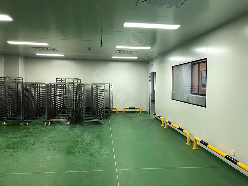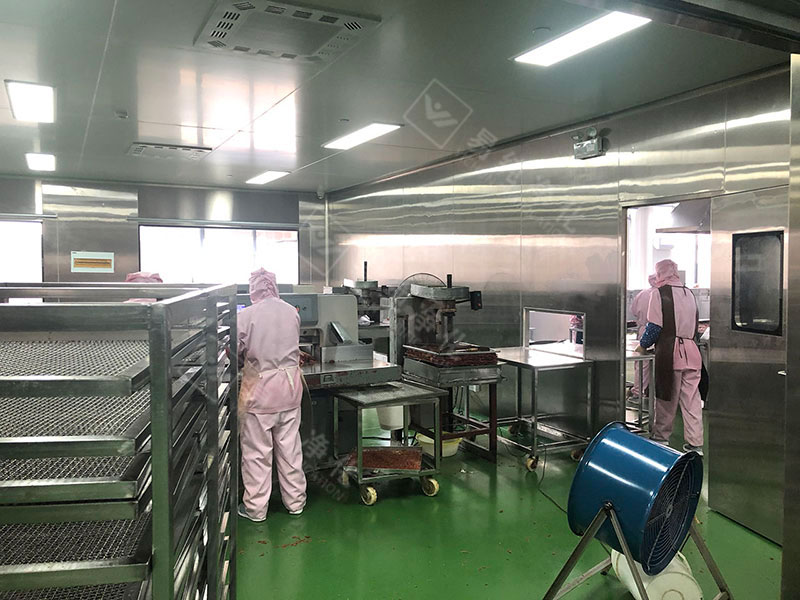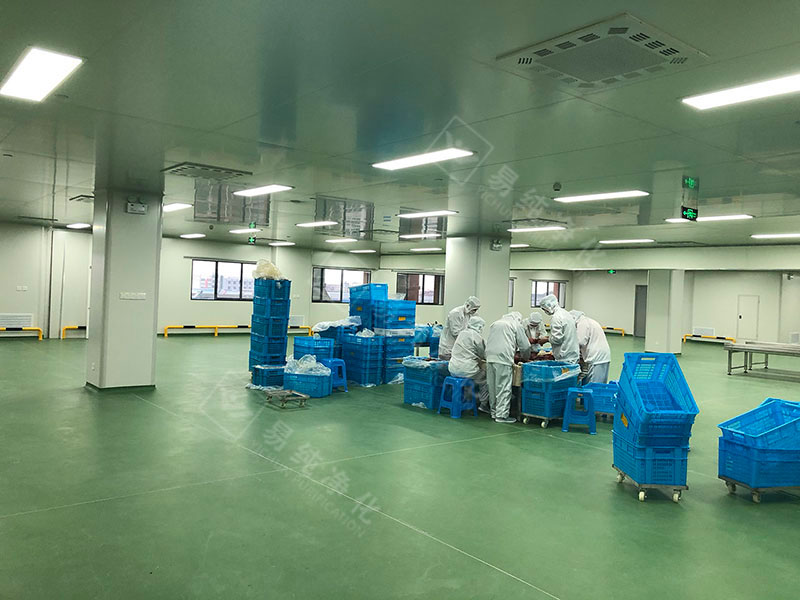 此次項目甲方需求8000平方十萬級凈化,局部功能車間需要無菌化,整體車間板材采用揚子江品牌手工板拼裝方式,十萬級凈化車間包括:解凍車間、絞肉車間、斬拌車間、成型車間,腌制車間、滾揉車間、生產車間、內包車間、冷卻車間、封裝車間等。